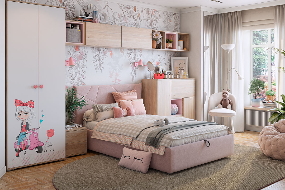 Модульная детская мебель - это стильная и яркая коллекция для девочек. Модный и стильный рисунок на фасадах и яркие ручки, придадут индивидуальность детской комнате. Принтерный рисунок устойчив к истиранию и ультрафиолету.