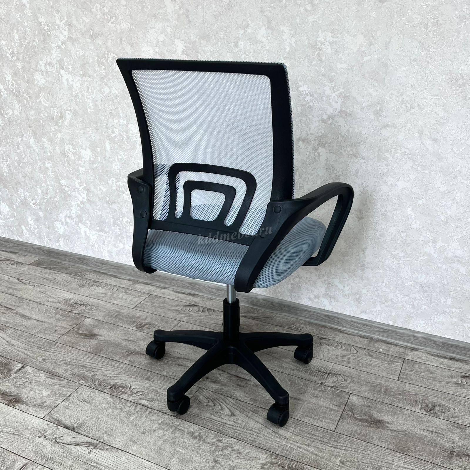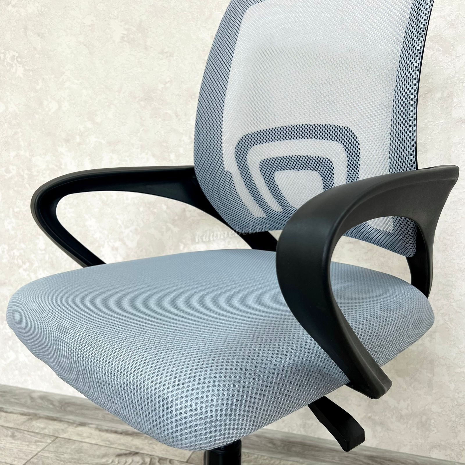 Современное офисное кресло с удобной спинкой, сиденьем из акриловой сетки и устойчивым пятилучным пластиковым основанием, снабжённым 50-мм двойными колёсиками.