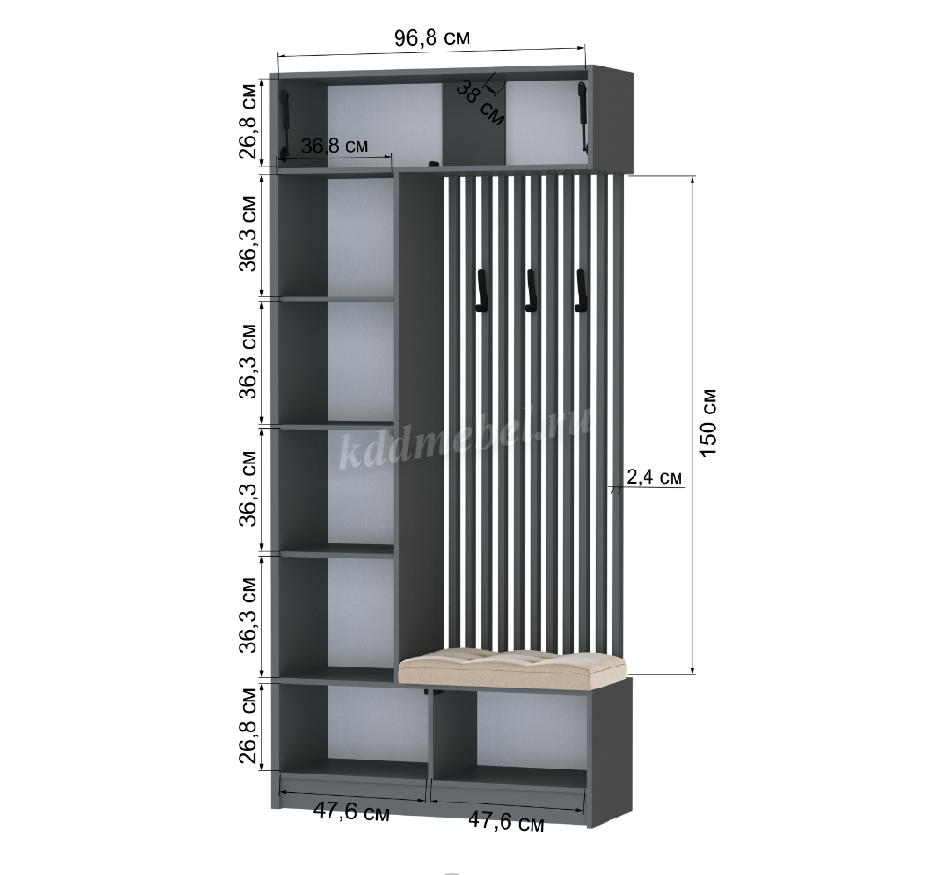 Ручки отсутствуют, крючки пластик, черные, покрытие soft-touch