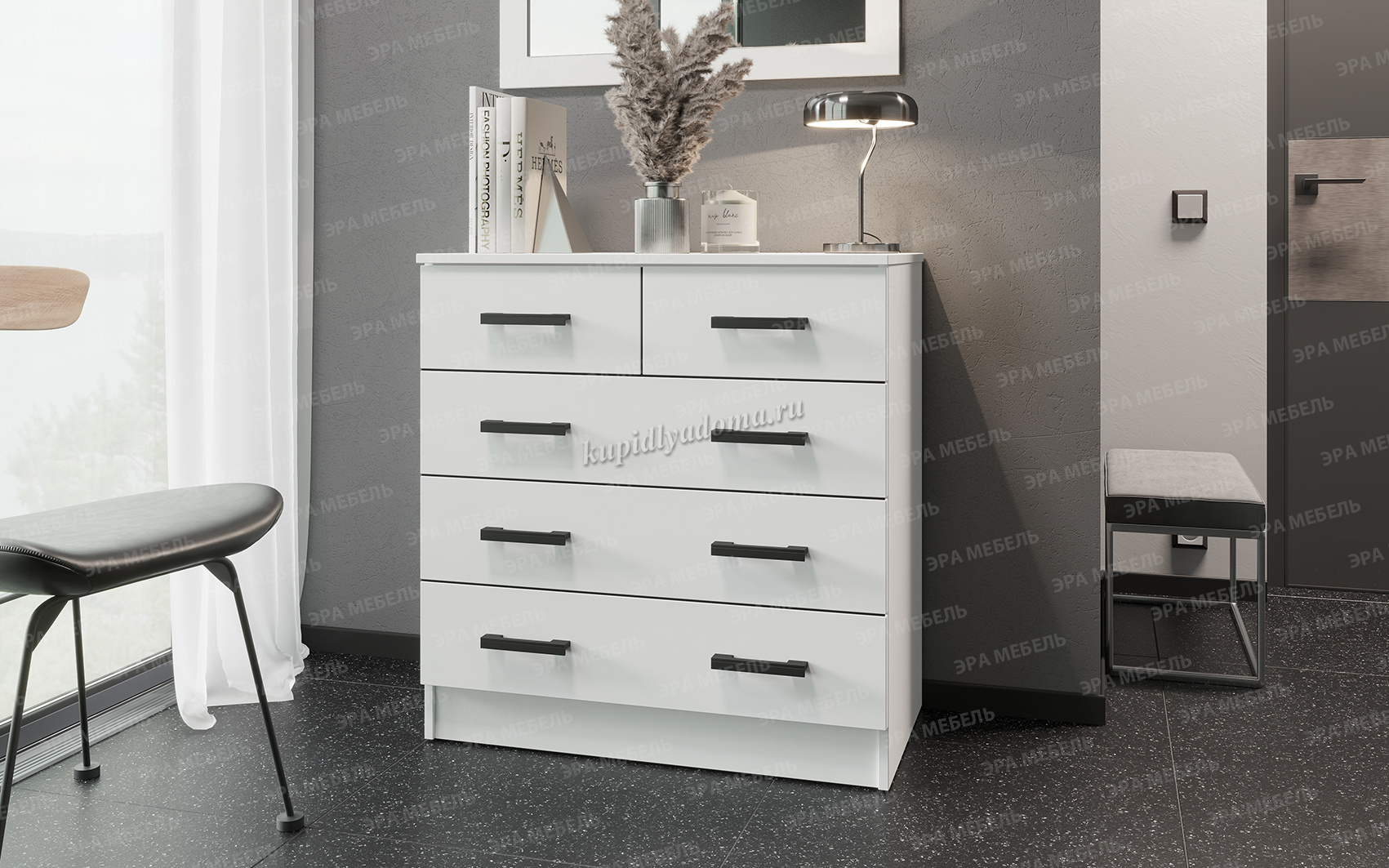 Комод оснащён пятью выдвижными ящиками (3 больших и 2 маленьких).