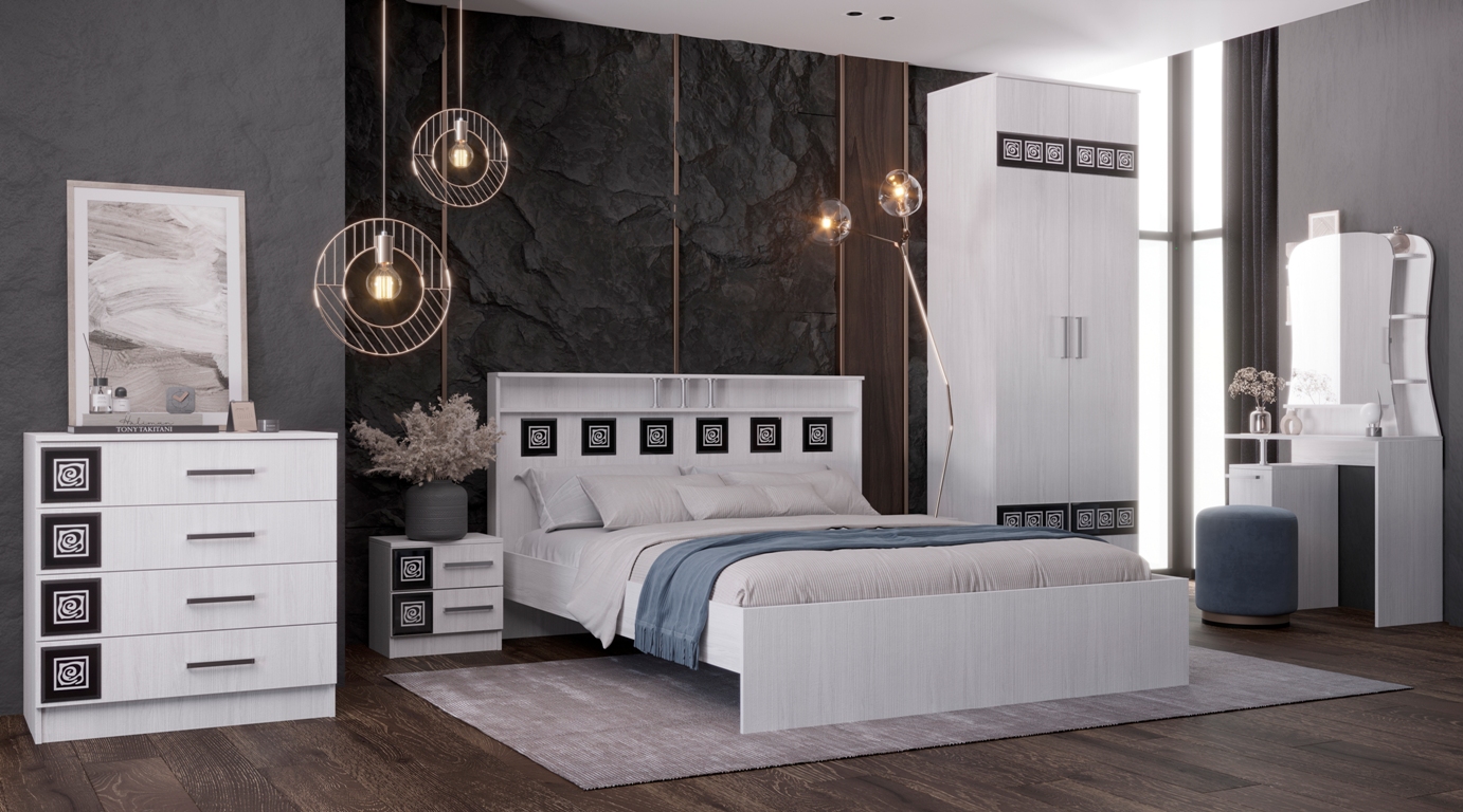 Изготавливается в цвете ясень шимо комбинированный, анкор светлый. На фасадах шкафов и изголовьях кроватей используется декоративно окрашенное стекло с фацетом. Все кровати комплектуются высокопрочными ортопедическими основаниями. На ящиках используются роликовые направляющие.